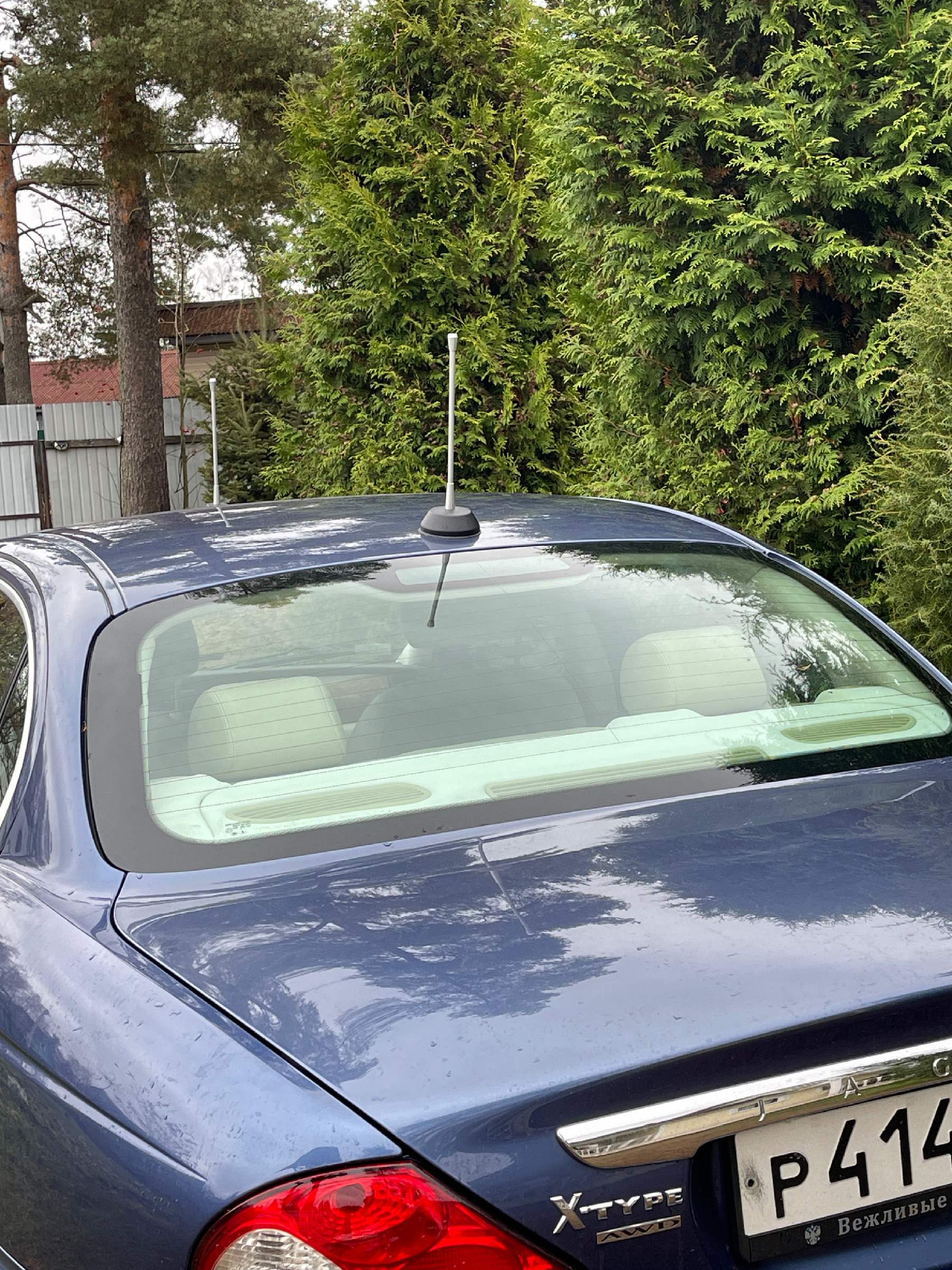 На автомобиле Ягуар Jaguar X-Type радио FM антенна интегрирована в обогреватель заднего стекла. Поэтому при мойке автомобиля никакие прутки откручивать не надо. Но никто не запрещал съемные антенны на магните, но не для приема радио, а для… красоты!