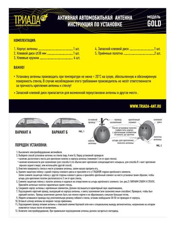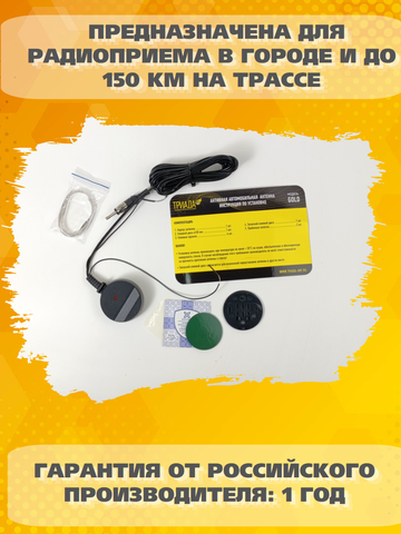 Антенна автомобильная активная внутрисалонная ФМ Триада-100 ГОЛД предназначена для радиоприема в городе и до 150 км на трассе. Состоит из круглого пластикового корпуса, из которого выходят тонкие гибкие металлизированные приемные полотна. Корпус устанавливается в угол лобового стекла или под зеркало заднего вида. Полотна приклеиваются вдоль кромки лобового стекла.