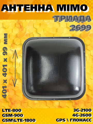Антенный комплекс Триада-2699 МИМО. Антенна специально разработана для обеспечения надежного доступа к мобильным сетям в составе системы MIMO, а также GPS навигации. Работает в диапазонах GPS/GLONASS /800/900/1800/2100/ 2400/2600 МГц.
