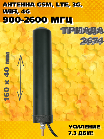 Антенна Триада-2674 применяется в ситуации, когда направление на источник сигнала сотовой связи неизвестно или все время меняется. Также антенна может быть использована совместно с репитерами для передачи абонентам внутри помещения, в котором необходимо передать или усилить сигнал сотовой связи 800, 900, 1800, 2100, 2400, 2600 МГц.